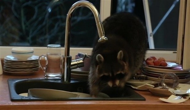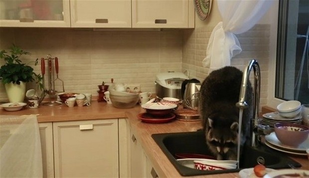 Rakun ev işlerini birkaç kırılan tabakla atlatıyor.