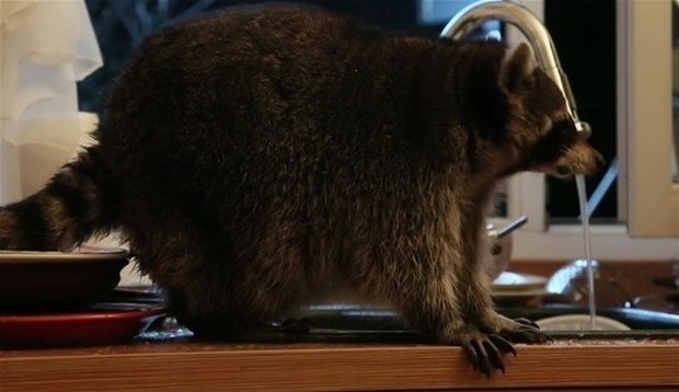 Kazakistan'ın Almatı şehrinde yaşayan sıradan bir aile, kendi mutfağında bulaşık yıkayan rakunu görünce şaşkına döndü.