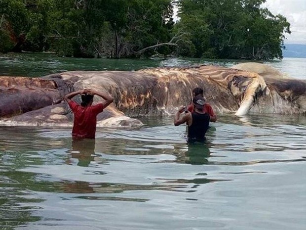Endonezya, Seram Adası'ndaki Maluku bölgesinde kıyıya vuran 15 metrelik deniz canlısını konuşuyor.