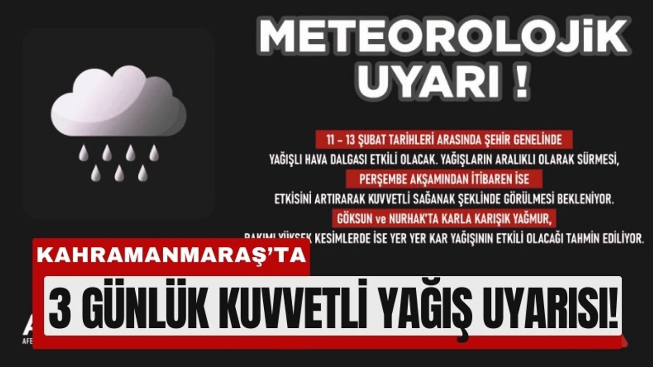Kahramanmaraş Büyükşehir Belediyesi Afet Koordinasyon Merkezi (AKOM), 11–13 Şubat tarihleri arasında şehir genelinde etkili olması beklenen yağışlı hava sistemi nedeniyle vatandaşlara uyarıda bulundu. Yapılan meteorolojik analizlere göre yağışların üç gün boyunca aralıklarla devam edeceği, 13 Şubat Perşembe akşam saatlerinden itibaren ise şiddetini artırarak kuvvetli sağanak şeklinde görüleceği bildirildi.