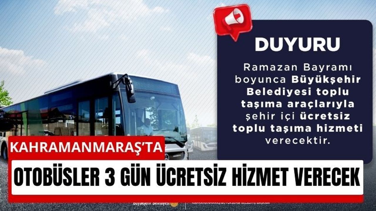 Kahramanmaraş’ta Kahramanmaraş Büyükşehir Belediyesi, Ramazan Bayramı süresince vatandaşlara önemli bir kolaylık sağlayacak. Belediye, bayram boyunca toplu taşıma hizmetlerini ücretsiz sunma kararı aldı.