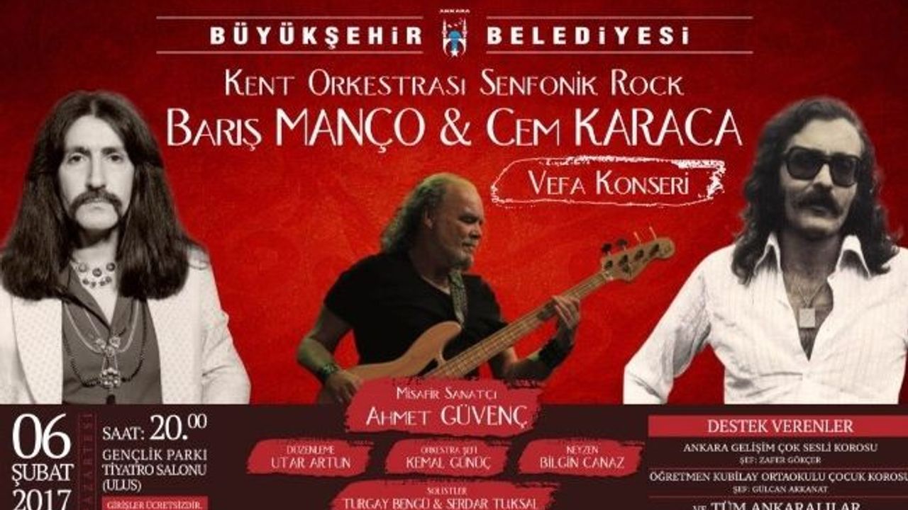 Ankara Büyükşehir Belediyesi Kent Orkestrası, Anadolu rock müziğinin unutulmaz sanatçıları Barış Manço ve Cem Karaca anısına, "Ustalara Vefa" konseri verecek.