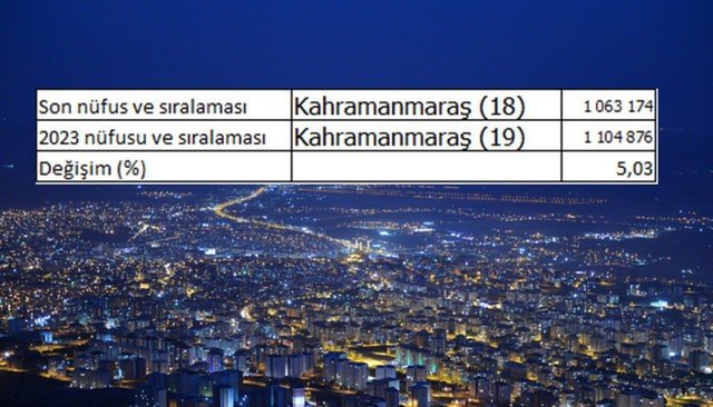 TUİK Türkiye'nin 2023 yılı nüfusunun ne kadar olacağını açıkladı. Şu anda 75.628.384 olan Türkiye nüfusu 2023'de 84.247.088 olacak ve nüfusumuz yüzde 11.40 artacak. Kahramanmaraş Türkiye ortalamasının altında bir nüfus artışına sahip olacak.