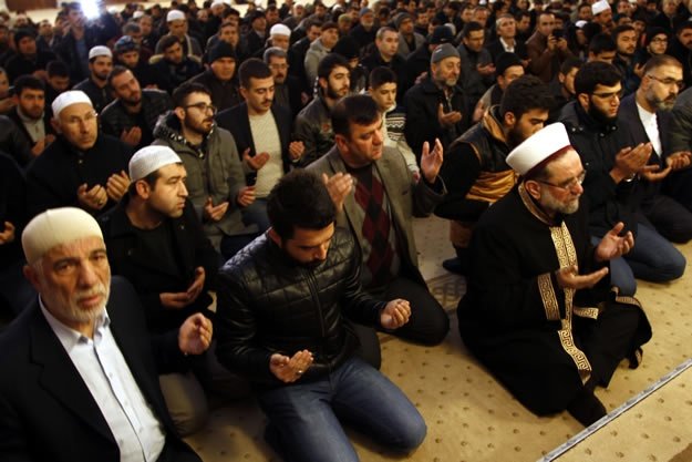 Kahramanmaraş'ta Abdulhamithan Camisi'nde Mescid-i Aksa imamı Yunus İkrimavi'nin (sol 2) kıldırdığı sabah namazı sonrası eller, Müslümanların huzuru ve İslam dünyasında akan kanların dinmesi için semaya kalktı.