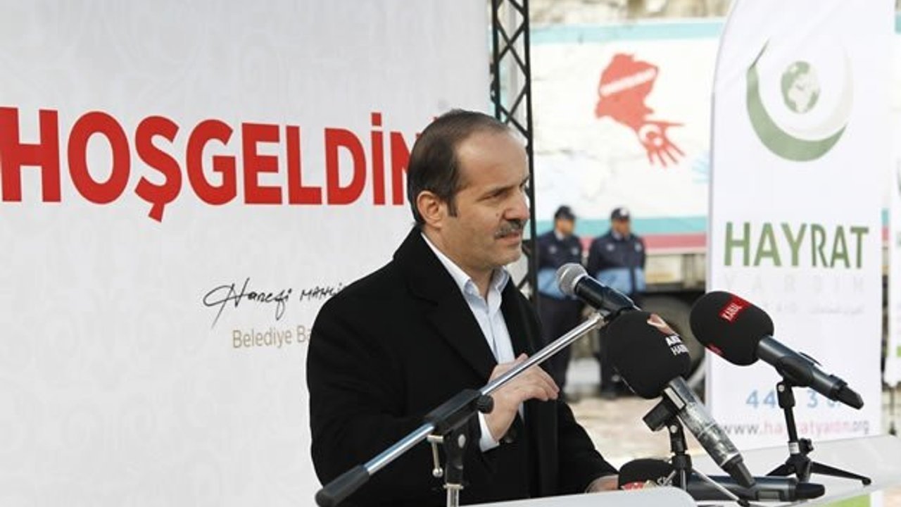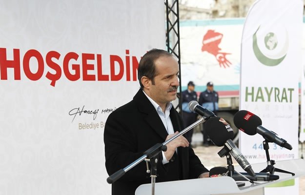 Hayrat İnsanı Yardım Derneği Başkanı Hakkı Aygün, Necip Fazıl Kültür Merkezi önünde düzenlenen programda konuşma yaptı.