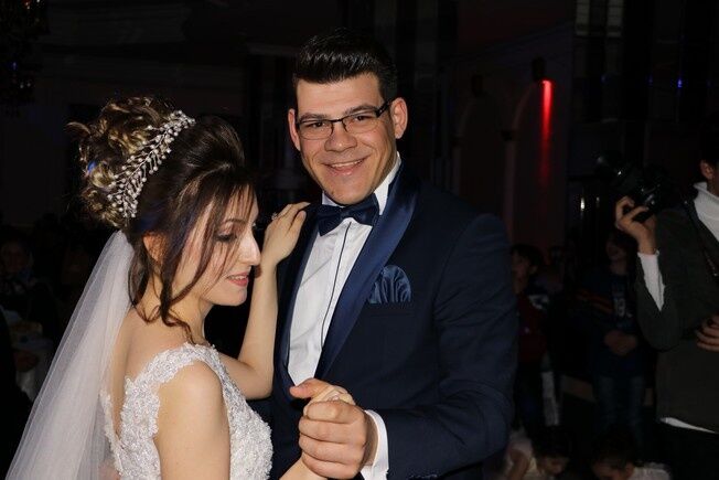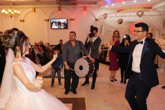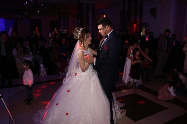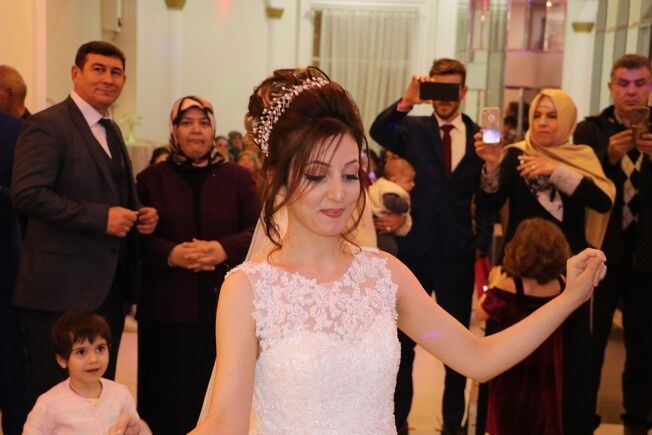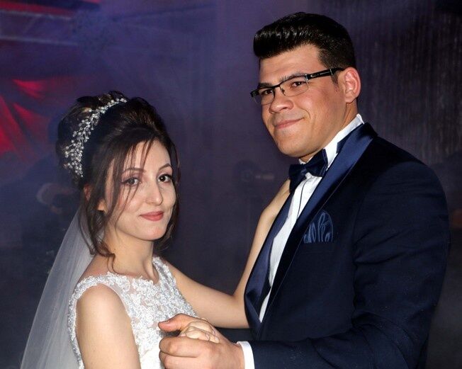 Özel bir düğün salonunda düzenlenen düğün töreninde gönüllerince eğlenen çift, müziği duymasalar da dans edip oyun havası oynadı.