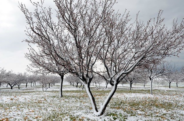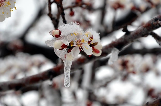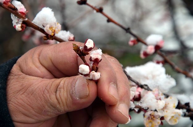 Kahramanmaraş'ın Elbistan ilçesinde etkili olan kar yağışı ve soğuk hava, çiçek açan kayısı ağaçlarını etkiledi.
