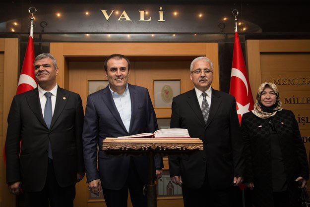 Kültür ve Turizm Bakanı Mahir Ünal (sol2), Kahramanmaraş Valisi Mustafa Hakan Güvençer'i (sağ2) ziyaret etti. Ünal, ziyaretinde Valilik Şeref Defterini imzaladı.