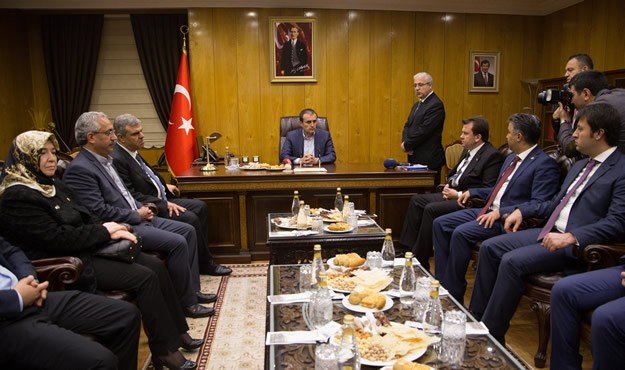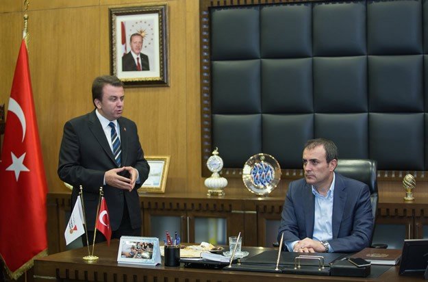 Kültür ve Turizm Bakanı Mahir Ünal (sağda), Kahramanmaraş Büyükşehir Belediye Başkanı Fatih Mehmet Erkoç'u (solda) makamında ziyaret etti.