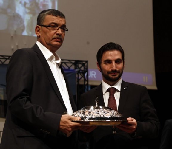 Türkiye Gençlik Vakfı Kahramanmaraş Şubesi tarafından Mehmet Akif Ersoy Kültür Merkezi'nde, Mescid-i Aksa imamı Yunus İkrimavi'nin katılımıyla, "Ümmetin vicdanı Filistin" konulu konferans düzenlendi. Programda, TBMM İçişleri Komisyonu Başkanı ve AK Parti Kahramanmaraş Milletvekili Celalettin Güvenç (sol1), Türkiye Gençlik Vakfı Genel Başkanı İsmail Emanet'e bakır tepsi hediye etti.