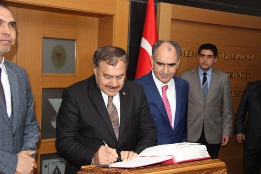 1 2 3 4 Orman ve Su İşleri Bakanı Veysel Eroğlu, DSİ tesislerinin toplu temel atma ve açılış merasimleri için geldiği kentte Kahramanmaraş Valiliğini ziyaret etti.