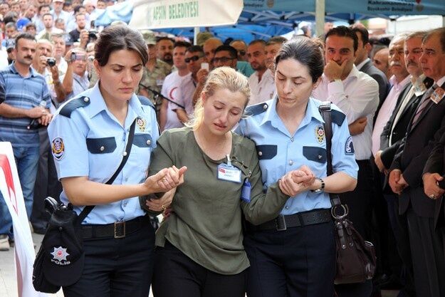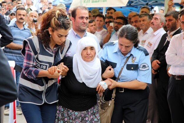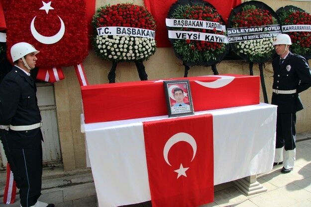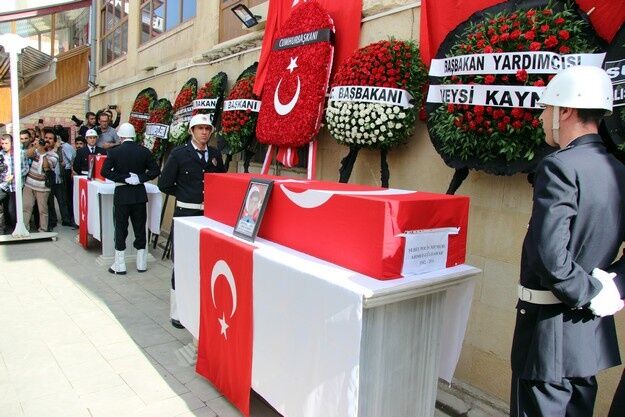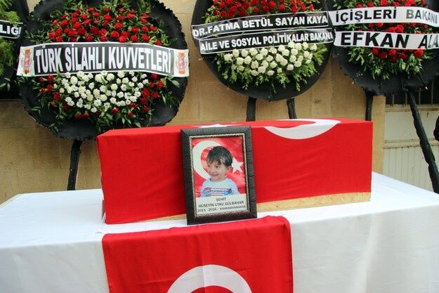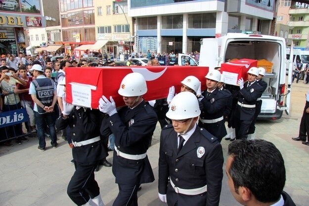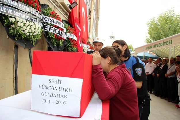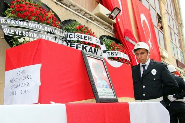 Diyarbakır’da PKK’lı teröristlerin Şehit Emniyet Amiri Murat Uçar Bölge Trafik Denetleme İstasyon Amirliği’ne bomba yüklü araçla yaptığı saldırıda şehit olan polis memuru Ahmet Gülbahar ve 5 yaşındaki oğlu Hüseyin Utku Gülbahar, son yolculuğuna gözyaşlarıyla uğurlandı.