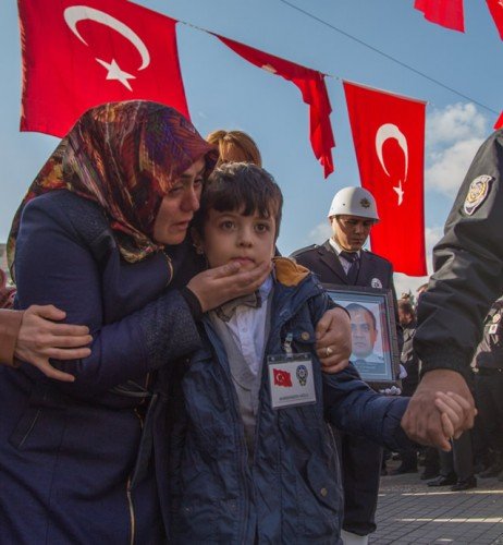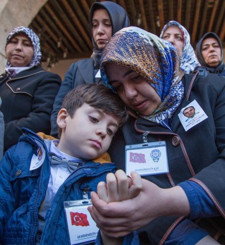 Diyarbakır'ın Sur ilçesinde terör saldırısı sonucu şehit olan polis memuru Ahmet Çiftaslan, Ulu Cami'de kılınan namazın ardından memleketi Kahramanmaraş'ta gözyaşları arasında toprağa verildi. Şehidin eşi Dilek (sağda) ve oğlu Muhammet Denizhan'ı yakınları teselli etmeye çalıştı.