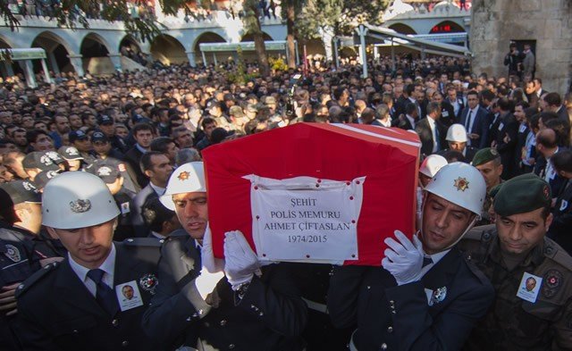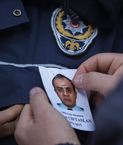 Diyarbakır'ın Sur ilçesinde terör saldırısı sonucu şehit olan polis memuru Ahmet Çiftaslan, Ulu Cami'de kılınan namazın ardından memleketi Kahramanmaraş'ta toprağa verildi. Meslektaşları, şehidin vesikalık fotoğrafını üniformalarına iliştirdi.