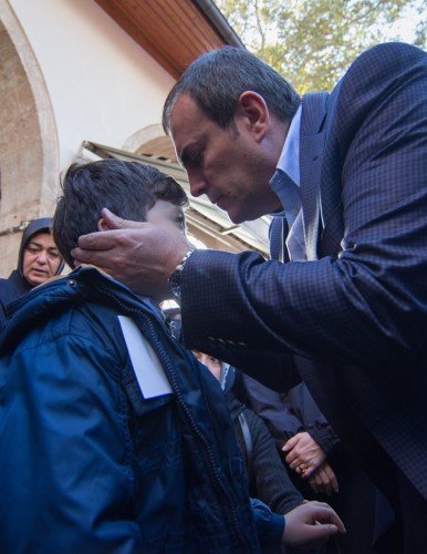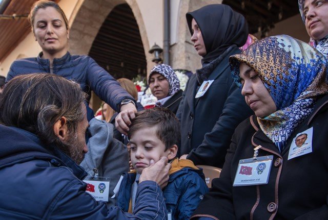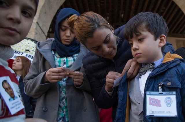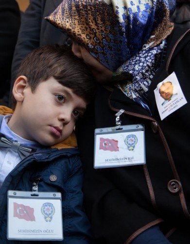 Diyarbakır'ın Sur ilçesinde terör saldırısı sonucu şehit olan polis memuru Ahmet Çiftaslan, Ulu Cami'de kılınan namazın ardından memleketi Kahramanmaraş'ta toprağa verildi. Şehidin oğlu Muhammet Denizhan'ın (sağda) ceketine babasının vesikalık fotoğrafı iliştirildi.