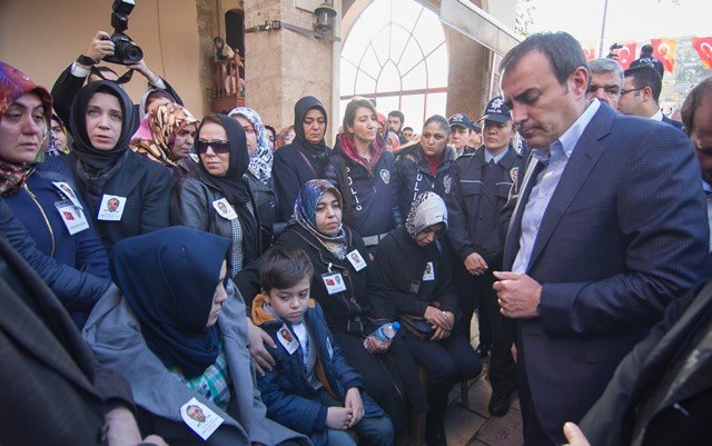 Diyarbakır'ın Sur ilçesinde terör saldırısı sonucu şehit olan polis memuru Ahmet Çiftaslan, Ulu Cami'de kılınan namazın ardından memleketi Kahramanmaraş'ta toprağa verildi. Kültür ve Turizm Bakanı Mahir Ünal (sağda), şehidin eşi Dilek, kızı Mehtap ve oğlu Muhammet Denizhan'a başsağlığı diledi.