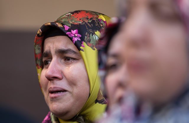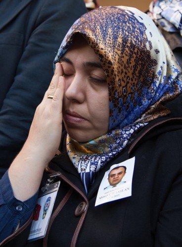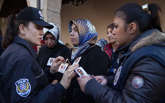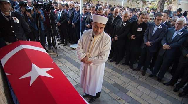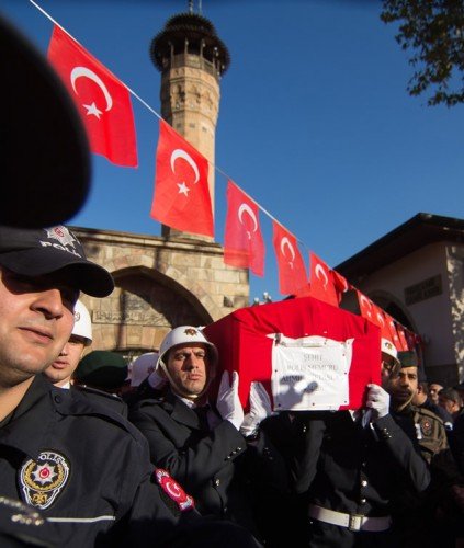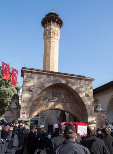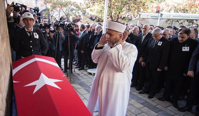 Diyarbakır'ın Sur ilçesinde terör saldırısı sonucu şehit olan polis memuru Ahmet Çiftaslan, Ulu Cami'de kılınan namazın ardından memleketi Kahramanmaraş'ta toprağa verildi. Şehidin fotoğrafı, eşi Dilek Çiftaslan'ın (ortada) ceketine iliştirildi.