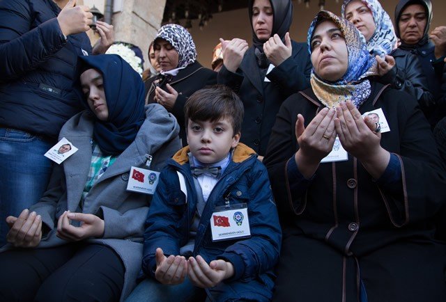 Diyarbakır'ın Sur ilçesinde terör saldırısı sonucu şehit olan polis memuru Ahmet Çiftaslan, Ulu Cami'de kılınan namazın ardından memleketi Kahramanmaraş'ta toprağa verildi. Şehidin eşi Dilek (sağda), oğlu Denizhan Muhammet (ortada) ve kızı Mehtap (solda), tören sırasında dua etti.