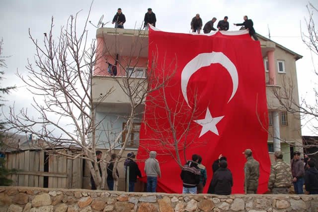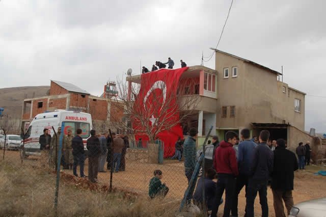 Şehidin, şehidin ilçeye bağlı Alpaslan Mahallesi'ndeki babaevine büyük bir Türk Bayrağı asıldı.