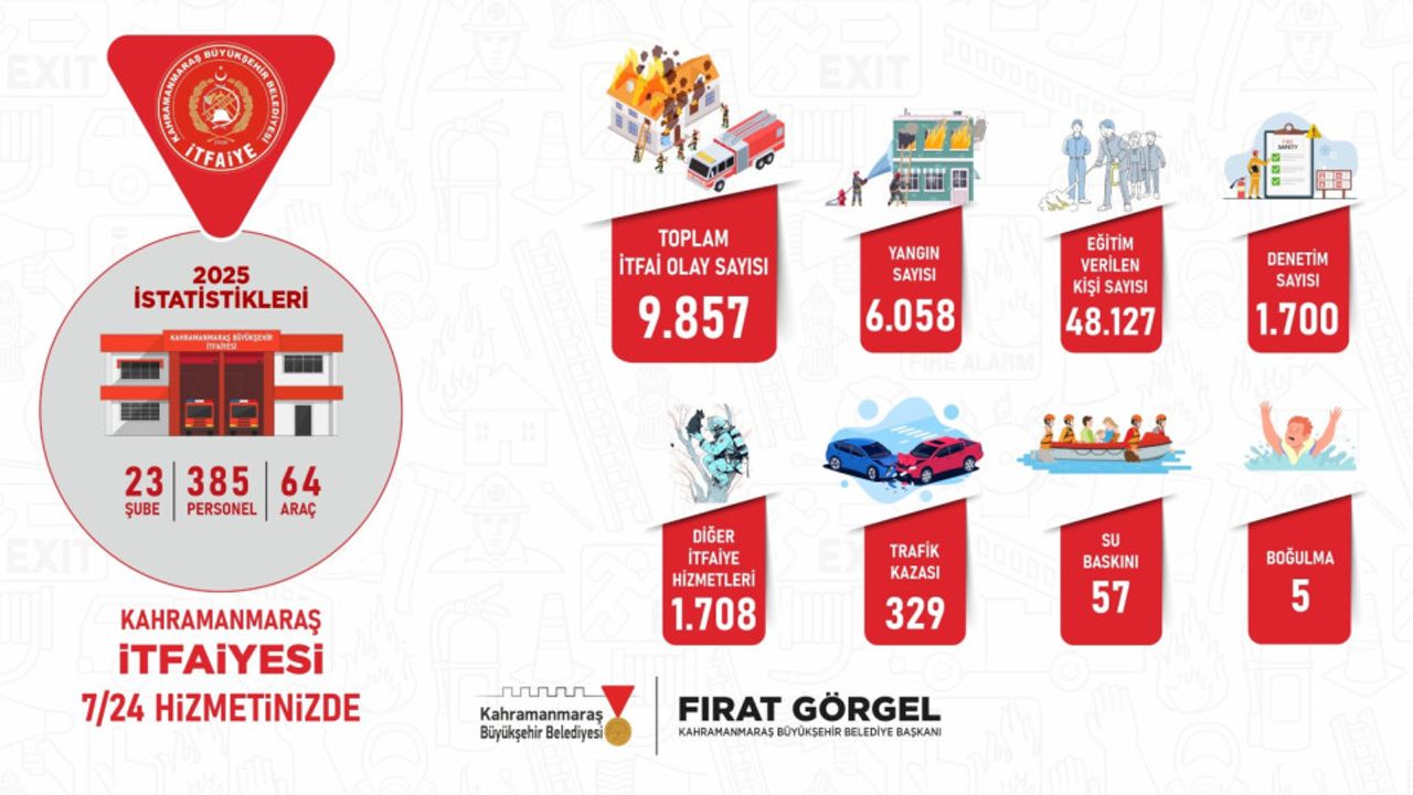Kahramanmaraş Büyükşehir Belediyesi İtfaiye ve Afet İşleri Dairesi Başkanlığı bünyesinde görev yapan ekipler, 23 şube, 385 personel ve 64 araç ile yıl boyunca sahada aktif olarak görev yaptı.