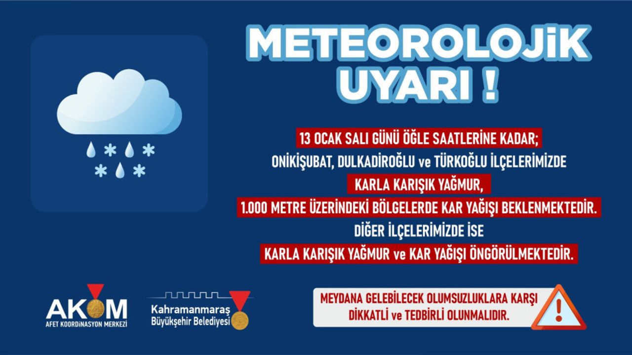 Kahramanmaraş Büyükşehir Belediyesi Afet Koordinasyon Merkezi, kent genelinde etkisini sürdüren yağışlı hava için vatandaşlara uyarıda bulundu. Yapılan açıklamada, olumsuz hava koşullarının 13 Ocak Salı günü öğle saatlerine kadar etkili olmasının beklendiği bildirildi.