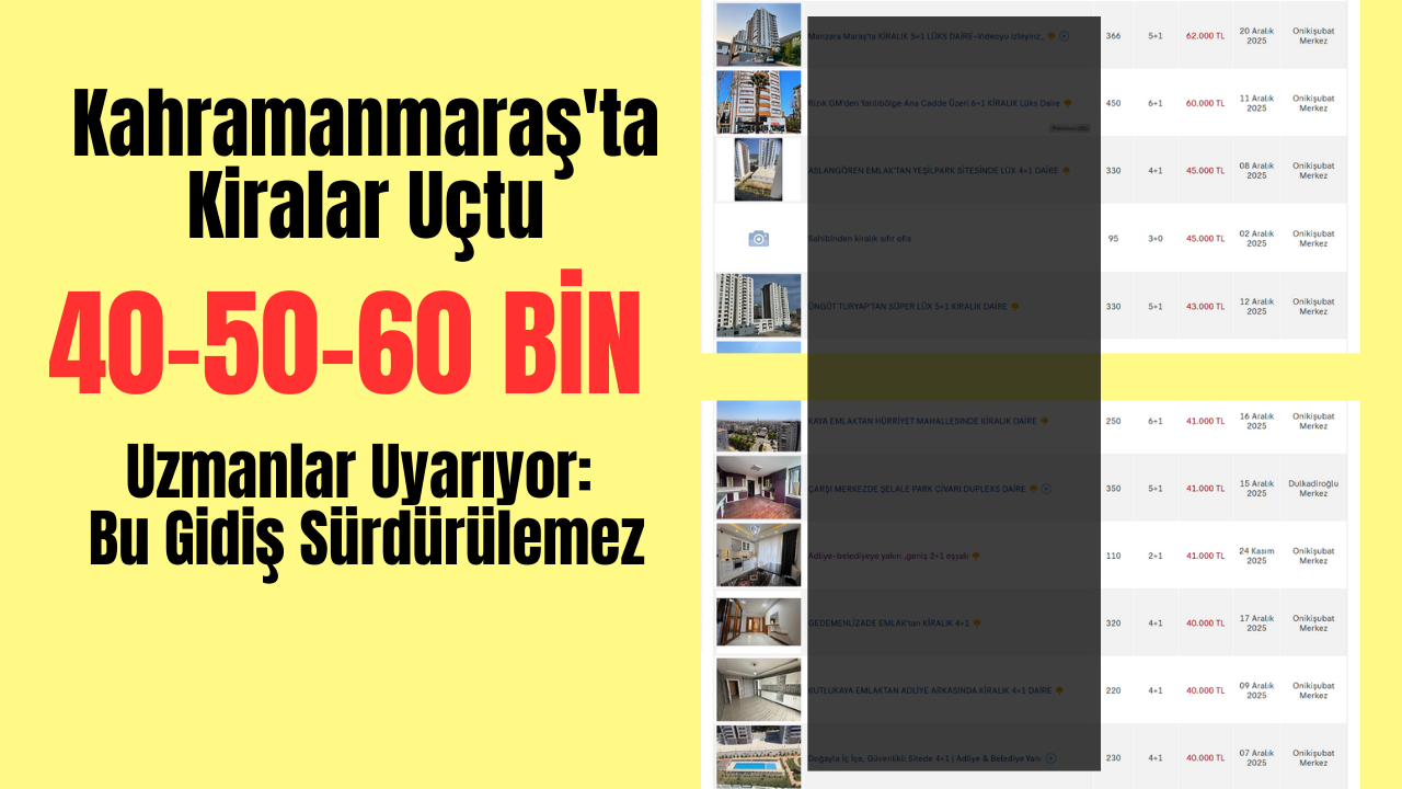 Kahramanmaraş'ta konut kiraları rekor seviyelere ulaştı. Özellikle Onikişubat ilçesinde yer alan 5+1 ve 6+1 dairelerin kira bedelleri 60 bin TL’ye kadar çıkmış durumda. Emlak sitelerinde yer alan ilanlara göre, merkezi lokasyondaki bazı daireler için istenen fiyatlar İstanbul, Ankara ve İzmir gibi büyükşehirlerle yarışıyor.