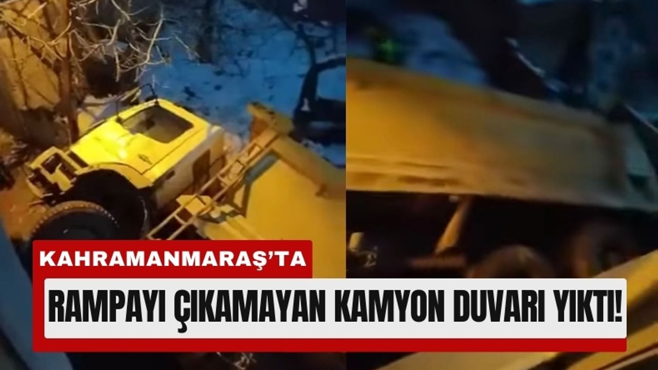Kahramanmaraş’ın Onikişubat ilçesinde yokuşu çıkmakta zorlanan bir kamyon, geri kayarak yerleşim alanında büyük hasara yol açtı.
