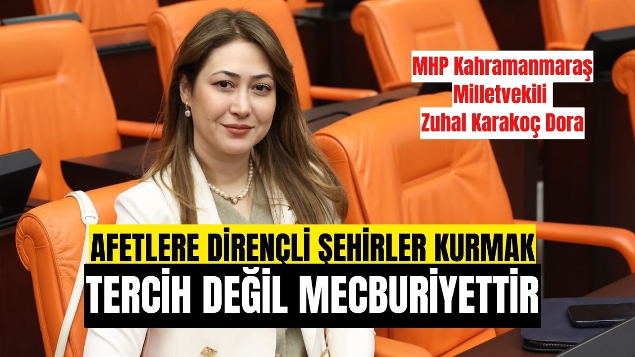 Genel Kurul’da söz alan MHP Kahramanmaraş Milletvekili Zuhal Karakoç, afetlere dayanıklı şehirlerin inşa edilmesinin bir zorunluluk olduğunu belirterek, Kahramanmaraş merkezli depremler sonrası yürütülen imar ve ihya çalışmalarının kararlılıkla sürdüğünü ifade etti.